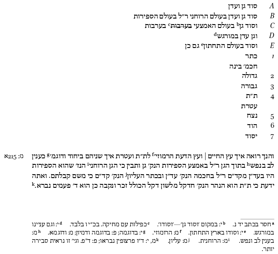| M: 215r | И вы видите, как Древо Жизни (Etz ha-ḥayyim, Эц ха-Хаим) и Древо Знания (Etz ha-daʿat, Эц ха-Даат), которые аллегорически указывают на [сфиры] Тиферет и Атерет, находятся в полном единстве. Так, например, подобно сердцу в теле человека, они находятся в Саду, то есть в центре сфирот, называемых Садом. Поймите, что этот духовный Сад, который и есть сфирот, находится в Эдене, на Востоке, (Эден ми-Кедем, Eden mi-Kedem по Быт. 2:8), то есть в Хохме, называемой Эден, и в Кетер Эльйон (Keter ʿElyon, Верховной Короне), называемой Кедем, откуда они получают свет34. И знайте, что Тиферет — это река, называемая Хидекель (Ḥidekel), от слова «декель» (dekel, пальма), которая включает в себя мужское и женское начала;35 и действительно, она была создана «двуликим»36. Но впоследствии Атара (ʿAtarah) была передана краеугольному камню (rosh pinah, рош пина)37, чтобы управлять нижними мирами [сферами]. И по этой причине — поскольку в саду растёт много деревьев — наука о Божественном называется «пардес» (т.е. «сад»), как сказали [Мудрецы]: «четверо вошли в сад»38. Это потому, что наука о Божественном действует на уровне формы (tzurah, цура) и цели (takhlit, тахлит) в отличие от всех остальных наук39. Необходимо преодолеть пределы всех прочих познаний, прежде чем прийти в Святая Святых. |