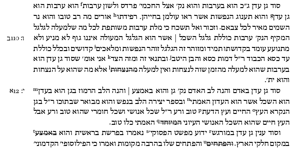 | V: 110v | Тайна Сада Едена также содержится в ʿАравот, который Мудрецы называют «садом» или «плодовым садом». Термин ʿАравот — значит ʿаревут (ʿarevut, приятность)40, что и есть Сад Едена — наслаждение душ, которые увидели свой [небесный] мир при жизни41. Его основание42 состоит из света — велика же его благость!43 — и он есть лампа небес, освещающая их воинство. Помните и не забывайте44, что слово ʿАравот может применяться (meshutefet, мешутефет)45 ко всему, что стоит выше окружающей сферы (galgal ha-makif, галгал ха-макиф), которая называется ʿАравот и включает в себя сферу интеллекта (galgal ha-sekhel, галгал ха-сэхель), а та, в свою очередь, является высшей сферой, но не телесной. Она неподвижна и вечно пребывает в своей святости46. От сияния (zohar, зохар) этой сферы исходит сияние душ и святых ангелов, охватывающее всё до Престола Славы — то есть, до образа Престола; усвойте этот момент как следует. Исходя из этого условия и на этом основании я утверждаю, что тайна Сада Едена заключается в ʿАравот, который превосходит время и потому вечен (natzḥut, нацахут)47. И нет никого выше, кроме того, кто сверхвечен, будучи Благословенным. |