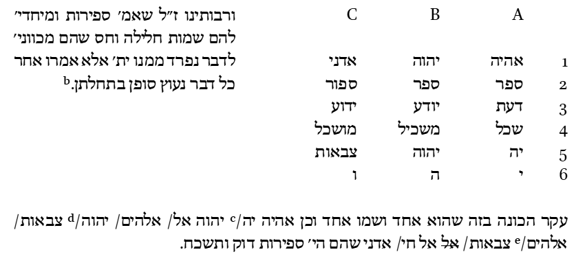 - Содержание этой таблицы — полдюжины примеров различий внутри Божественного, которые, как и сфирот, не нарушают единства Бога, — основано на учении Йосефа бен Шалома Ашкенази: «Все эти пути заключены в трёх книгах, которые являются тремя Именами, то есть אהיה הויה אדני [Ахья, Хавайя, Адонай]. Все пути этих образцов, включены в ספר ספר וספור [сэфер, сфар и сфур], то есть в три буквы Благословенного Имени — юд-хей-вав, и соответствуют интеллекту (сэхель), интеллектуализации (маскиль) и интеллектуализированному (мускаль), а также знанию (даат), знающему (йодэа) и известному (йадуъа)». Ашкенази, работа 1965 года, с. 17 (лицевая сторона). Сам Ашкенази, в свою очередь, вдохновлялся Маймонидом, как указано у Шломо Пинеса в работе 1963 года, сс. 163–166. ↩︎