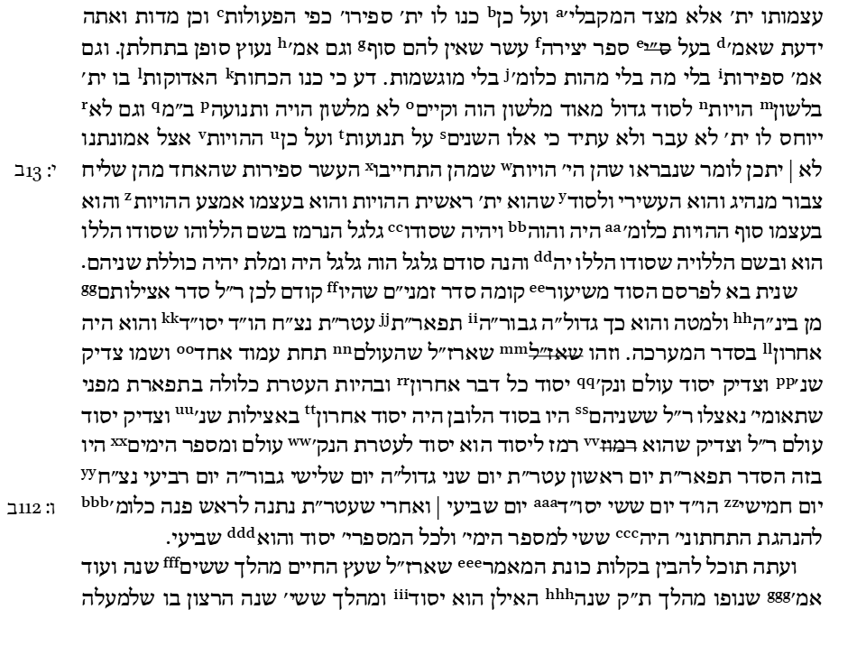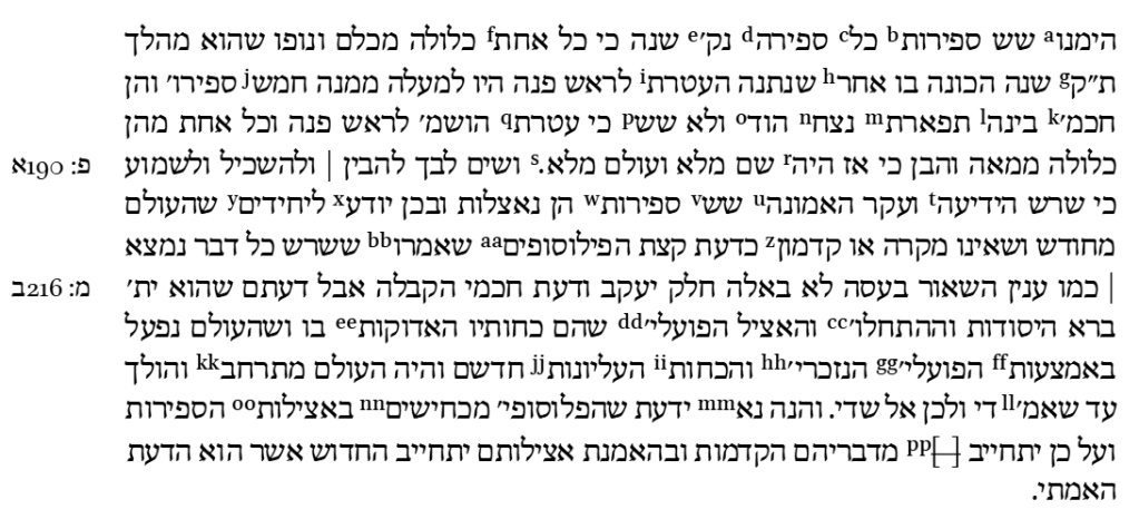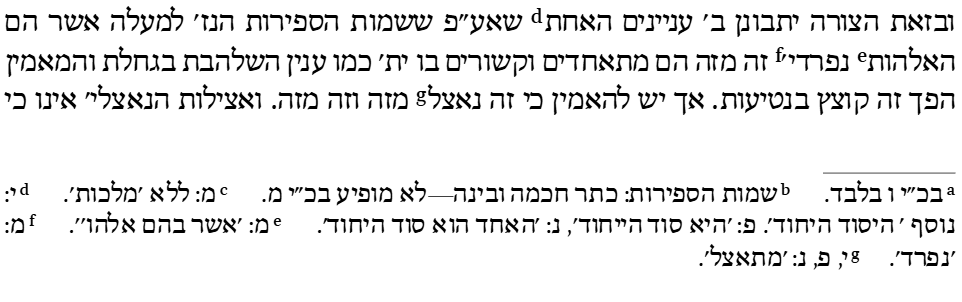 | N: 26v | Во-вторых, [эта форма] призвана явить (лефарсем), что когда в Его мысли (даато) возникло намерение привести все Его деяния (поалав) в бытие (лехамци), уже в Его существующей Славе (кеводо) и Свете было очевидно, что ничего нового не возникло ни в Эманаторе, ни в эманированном. И раскрылись Его Слава, Его блеск и Его сокровенная Сила (хевьон узо). Из Своей Славы Он сотворил десять сфирот, которые не имеют врождённого конца, не восприимчивы к исследованию или ограничению, и сделал их подверженными созерцанию и ограничению в рамках атрибутов, обладающих границами и постижимостью, несмотря на то, что изначально в себе они не содержат | |