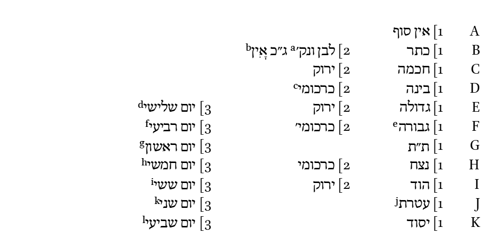 | 1 | Кетер (Keter, Корона, Венец) Хохма и Бина (Ḥokhmah Binah, Мудрость и Понимание («ум», «понимание», «распознавание»)) |