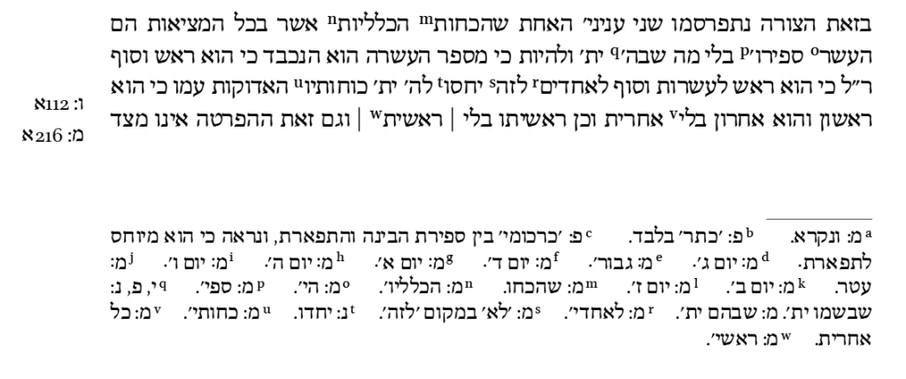 | V:112r |M:216r| | В этой форме две вещи стали явными (nitparsemu, нитпарсему). Первая из них: универсальные силы всего сущего — это «десять нематериальных (belimah, белима)60 сфирот», пребывающих внутри Господа, да будет Он благословлен. Число десять благородно, оно является началом и концом, то есть первое из десятков и последнее из единиц. Поэтому силы эти, присущие Ему, да будет Он Благословен, приписываются Ему же как Ему присущие. Ибо он — первый, и Он же — последний без конца, и Его начало — без |начала|. Однако такое разделение (hafratah, хафрата) осуществляется не с точки зрения Его сущности, да будет Он благословлен, а только с точки зрения воспринимающих его61. Поэтому они обозначили Его, да будет Он благословлен, с помощью сфирот, которые соответствуют Его деяниям и Его качествам62. Вы знаете, что автор «Sefer yetzirah» сказал: «десять, у которых нет предела» и «их конец заключён в их начале»63. Также он сказал: «сфирот bli mah бли мах (досл., «без чего-либо»)»64, то есть без сущности, без телесности (mugshamut, мугшамут). Знайте, что силы эти, присущие Ему, да будет Он благословлен, назывались havayot хавайот, что — и это великий секрет — происходит от слов «настоящее» (hoveh, хове) и «устойчивый» (kayam, каям), а не от «бытие» (havaya, хавая) и «движение» (tenuʿah, тенуа), Боже упаси. И они не приписывали Ему, да будет Он благословен, ни прошлого, ни будущего, потому что и то, и другое подразумевает движение. Поэтому, согласно нашей вере, нельзя сказать, что havayot хавайот были сотворены, так как они — десять havayot хавайот, которые обусловили десять сфирот. Один из них [один из havayot хавайот] — посланник общины (shaliyaḥ tzibbur, шалиях циббур)65, лидер, и он — десятый. Это связано с тайной того, что Он, да будет Он благословлен, есть начало havayot хавайот, Он же является серединой havayot хавайот и Он же — конец havayot хавайот, то есть «Он был, Он есть и Он будет» (hyh ve-hvh ve-yhyh). Тайна эта — круг (galgal, галгаль), на который похоже по звучанию имя “ Halleluhu” (Псалом 150), тайна которого — «hallelu hv» и имя «Halleluyah», тайна которого hallelu y h. Вот их тайна: круг hvh, круг hyh, а слово yhyh включает в себя оба круга. Вторая [форма]: раскрывает тайну (lefarsem, лефарсем) Измерения Высоты [Божественного] (shiʿur komah, шихур комах)66 и порядок времён (seder zmanim, седер зманим), который был прежде — то есть порядок их эманаций, начиная с Бины и далее вниз. Таким образом: Гдула, Гвура, Тиферет, Атерет, Нецах, Ход, Йесод67 — и Йесод является последним в конфигурации «созвездия»68. Это соответствует словам наших мудрецов, да будет память о них благословенна: мир держится на одном столпе, называемым tzaddik цаддик (праведник), как написано: «праведник — вечное основание» [прим. пер.: праведник — основа мира] (tzaddik yesod ʿolam, цаддик йесод олам) (Притчи 10:25)69. И каждая завершающая структура называется Йесод. А поскольку Атерет включена в Тиферет, потому что они эманировали как близнецы, то есть оба заключены в тайне белой субстанции (loven, ловен)70, то Йесод завершает эманацию; как и было написано: «праведник — вечное основание». Другими словами, «праведник», намекающий на Йесод, — это основание (йесод) для Атерет, называемой «миром». И порядок дней следующий: Тиферет — первый день, Атерет — второй, Гдула — третий, Гвура— четвертый, Нецах — пятый, Ход — шестой, Йесод — седьмой. После того как Атерет была поставлена как краеугольный камень (rosh pinah, рош пина)71, то есть для управления нижними сферами, Йес